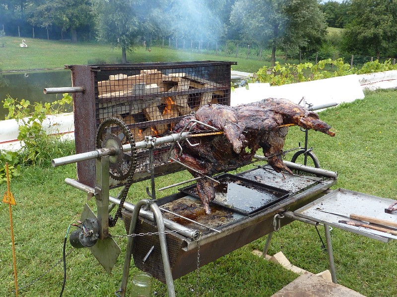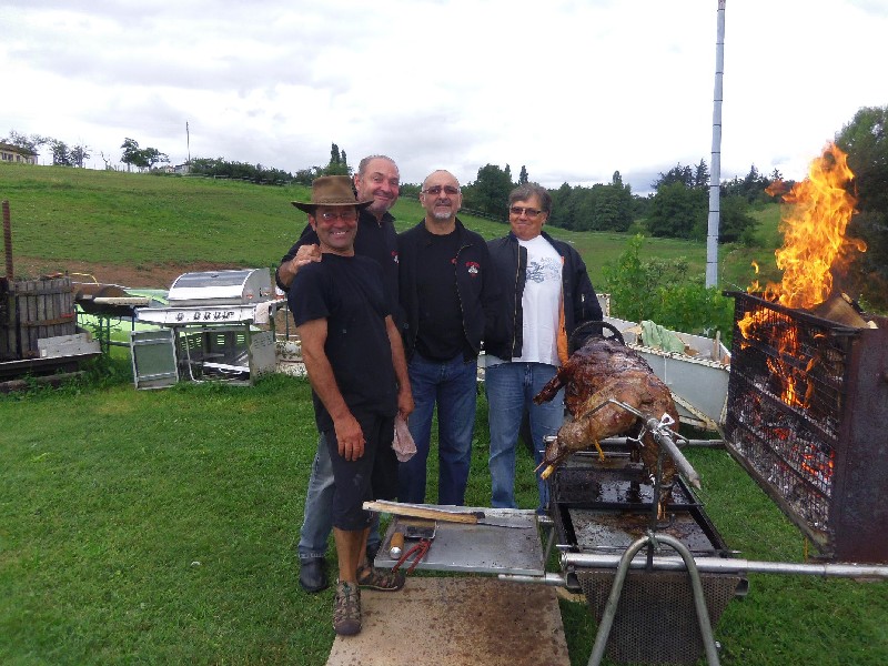 Nous avons commencé par l'apéro (punch fourni par notre Gnaf national ou international je sais plus trop). Après, nous avons dégusté un super cochon cuit et fourni par le cuistot en chef : Robinood , bestiole agrémentéé des salades, ratatouilles, fromages et dessert, confectionnés avec amour (ou avec les doigts suivant le plat) par nos compagnes respectives. Mine de rien nous étions 39 à table. Qui dit mieux.