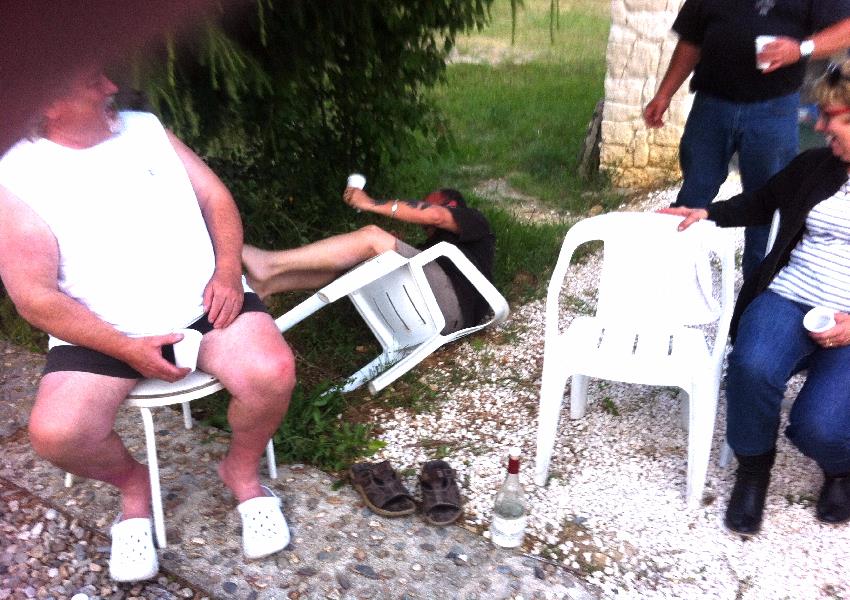 Photo ci-dessus tout le monde est réuni (sauf le Président qui prend la photo – au fait sa Harley à carburateur est rentrée sur remorque, courroie encore cassée ! -. Photo ci-contre Thierry qui a décidé de finir son pastis par terre.
