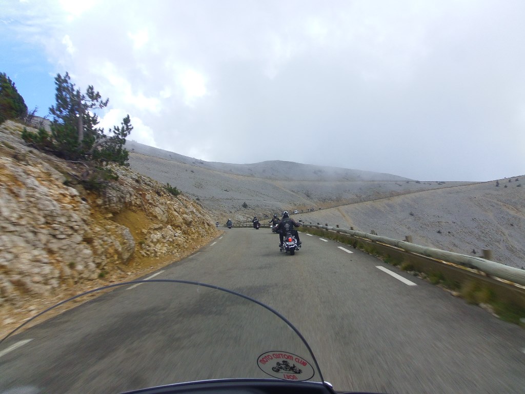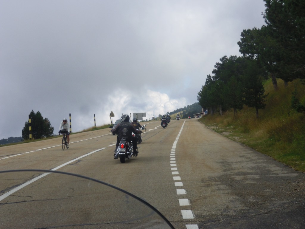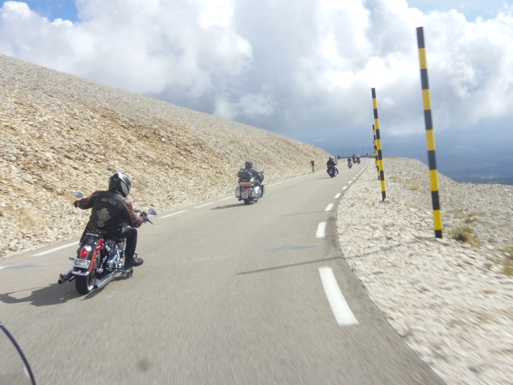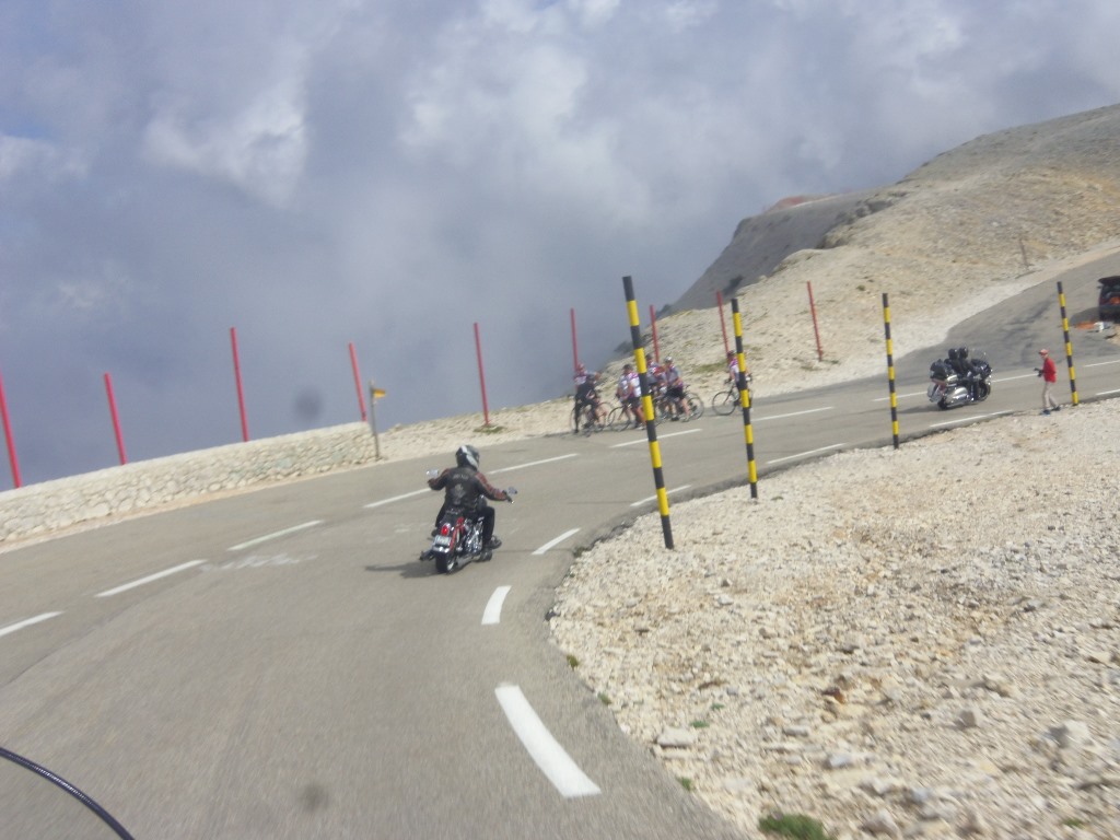 Après le repas ascension du mont ventoux (ouf pas en vélo..). Le géant de Provence, fidèle à sa réputation, était assez encombré. Nous avons survécu à cette ascension et à la descente, après une pause café dans un bar en bordure de route où, Jipé, le cuistre, a couché sa moto en voulant tourner tout seul. Tant pis l'avait qu'à faire de la muscu ou prendre une moto moins lourde. Non mais... Enfin pas de bobo.