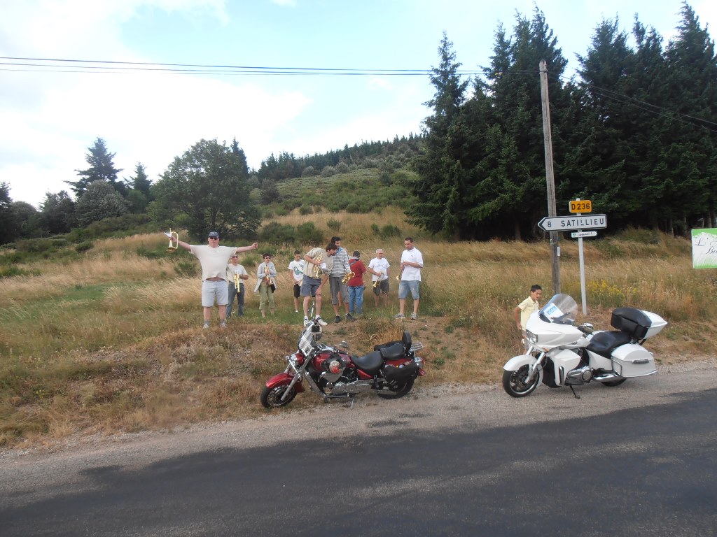 Reconnaissance le matin dans les horaires prescrits et avec des guides compétents. Répartition des tâche et après un petit lunch, départ de la grande boucle. Non pas de caravane publicitaire, nous sommes là en toute discrétion. Environ 54 kilomètres de routes. Le premier a bouclé cela en à peine plus de 2 heures, les derniers un peu plus. Mais l'essentiel c'est de participer. Pöur encourager les coureurs une fanfare a même été prévue. A mon avis c'est du vice ou de la torture. Pour les néophytes le col MARCHAND doit son nom au centenaire qui a battu le record de l'heure sur piste il y a peu. Son nom a été donné à ce col qu'enprunte l'ARDECHOISE. Un peu de culture ne nuit pas à la santé.
