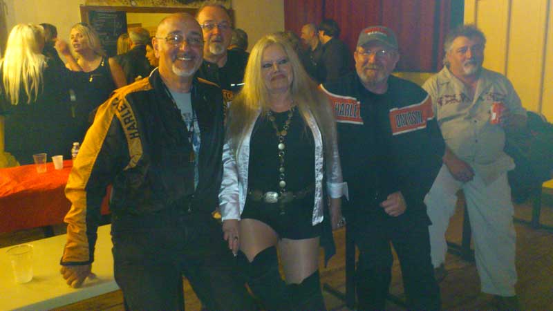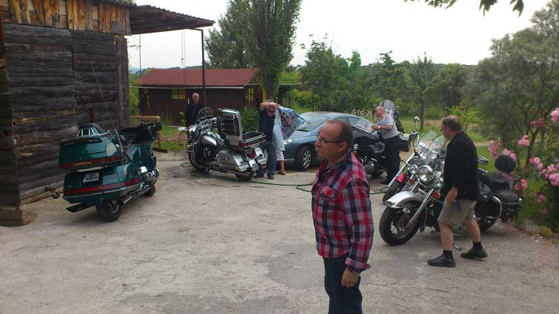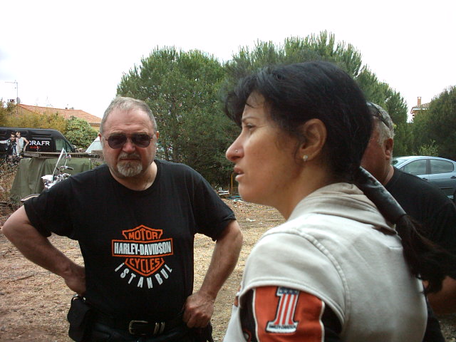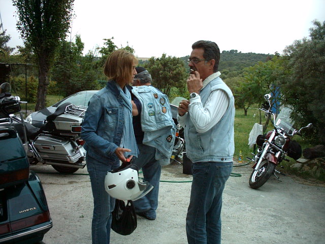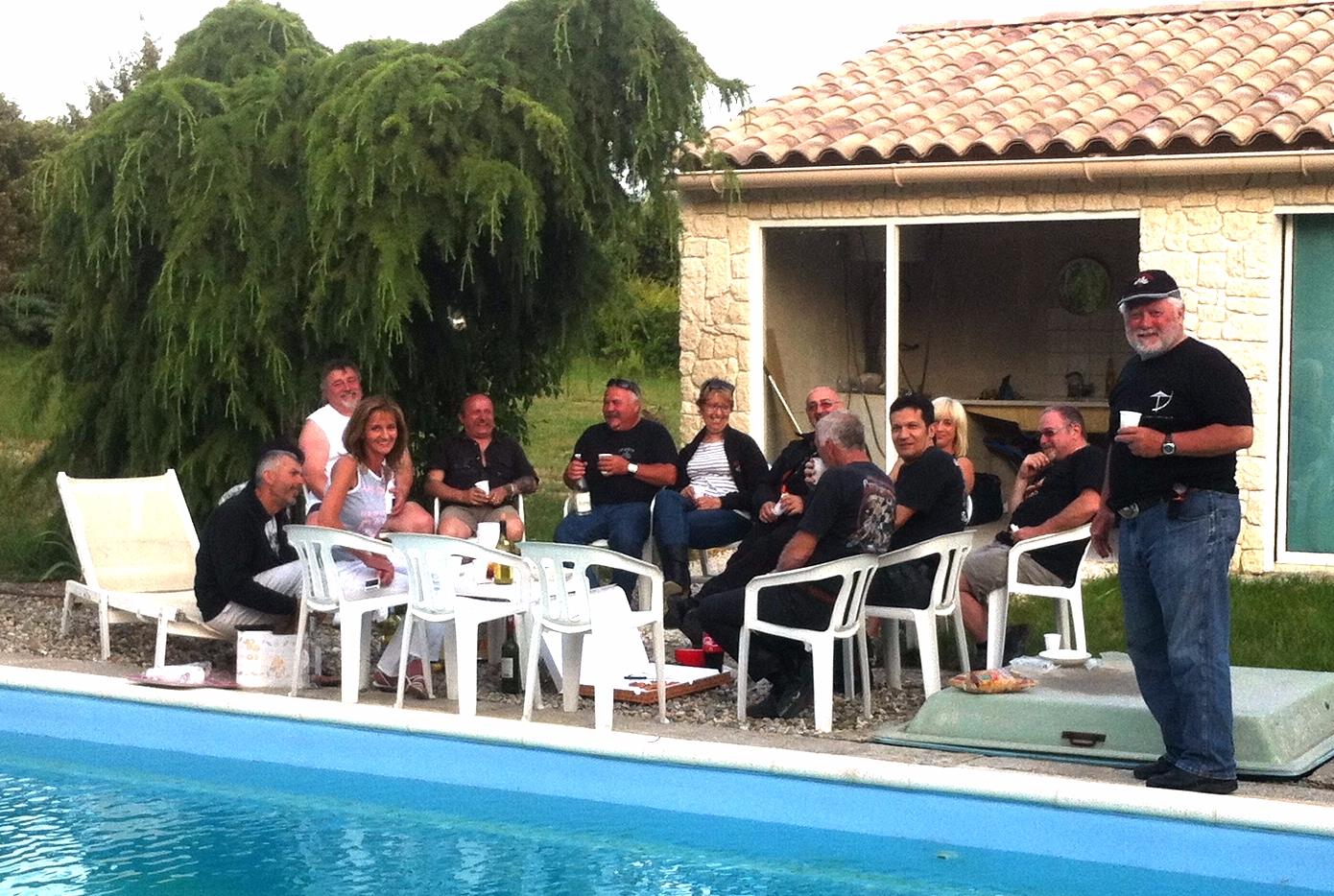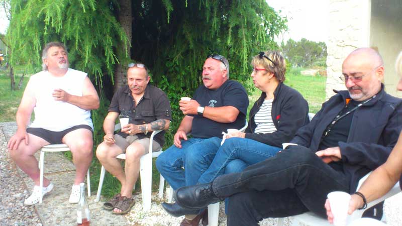Photo ci-dessus tout le monde est réuni (sauf le Président qui prend la photo – au fait sa Harley à carburateur est rentrée sur remorque, courroie encore cassée ! -. Photo ci-contre Thierry qui a décidé de finir son pastis par terre.