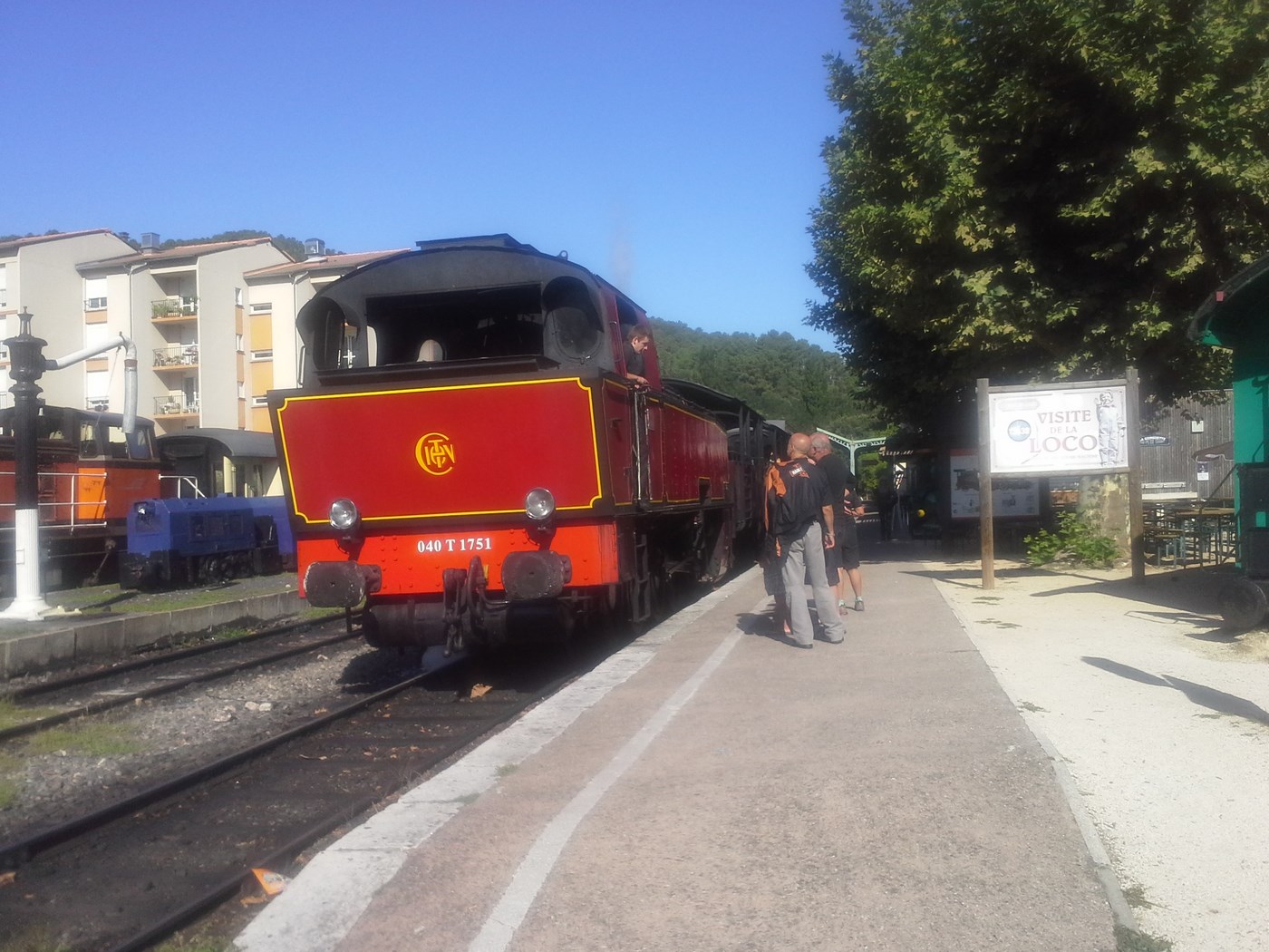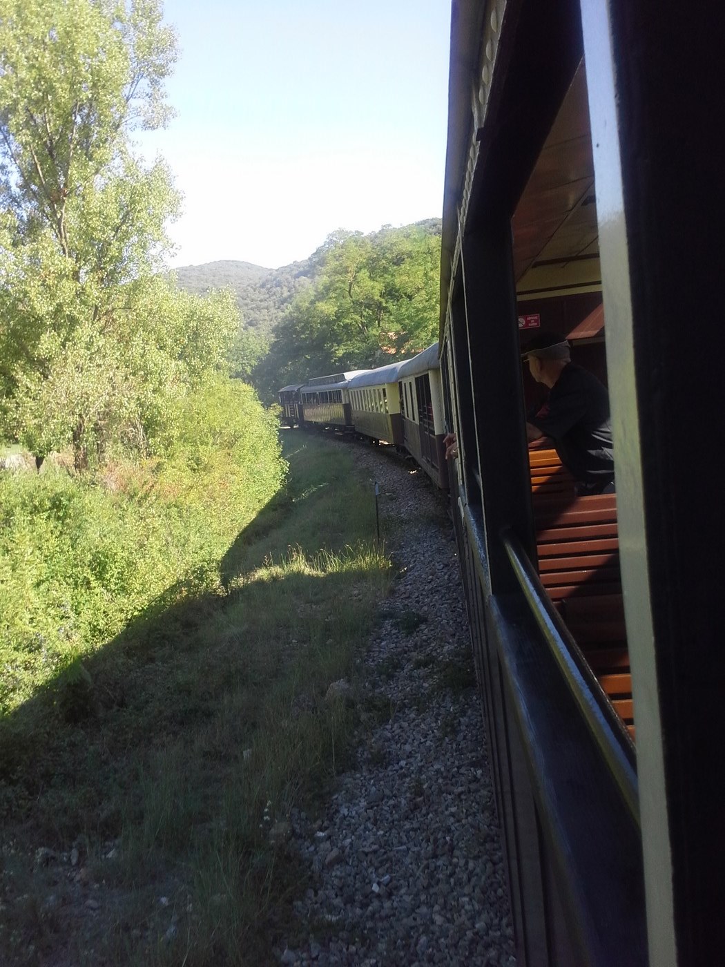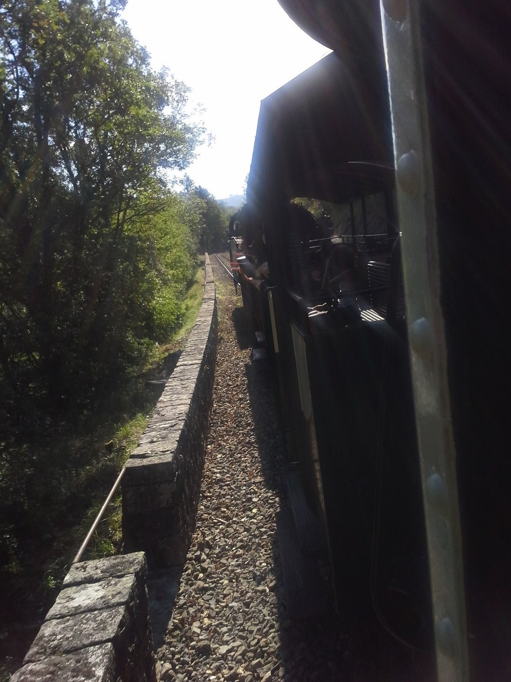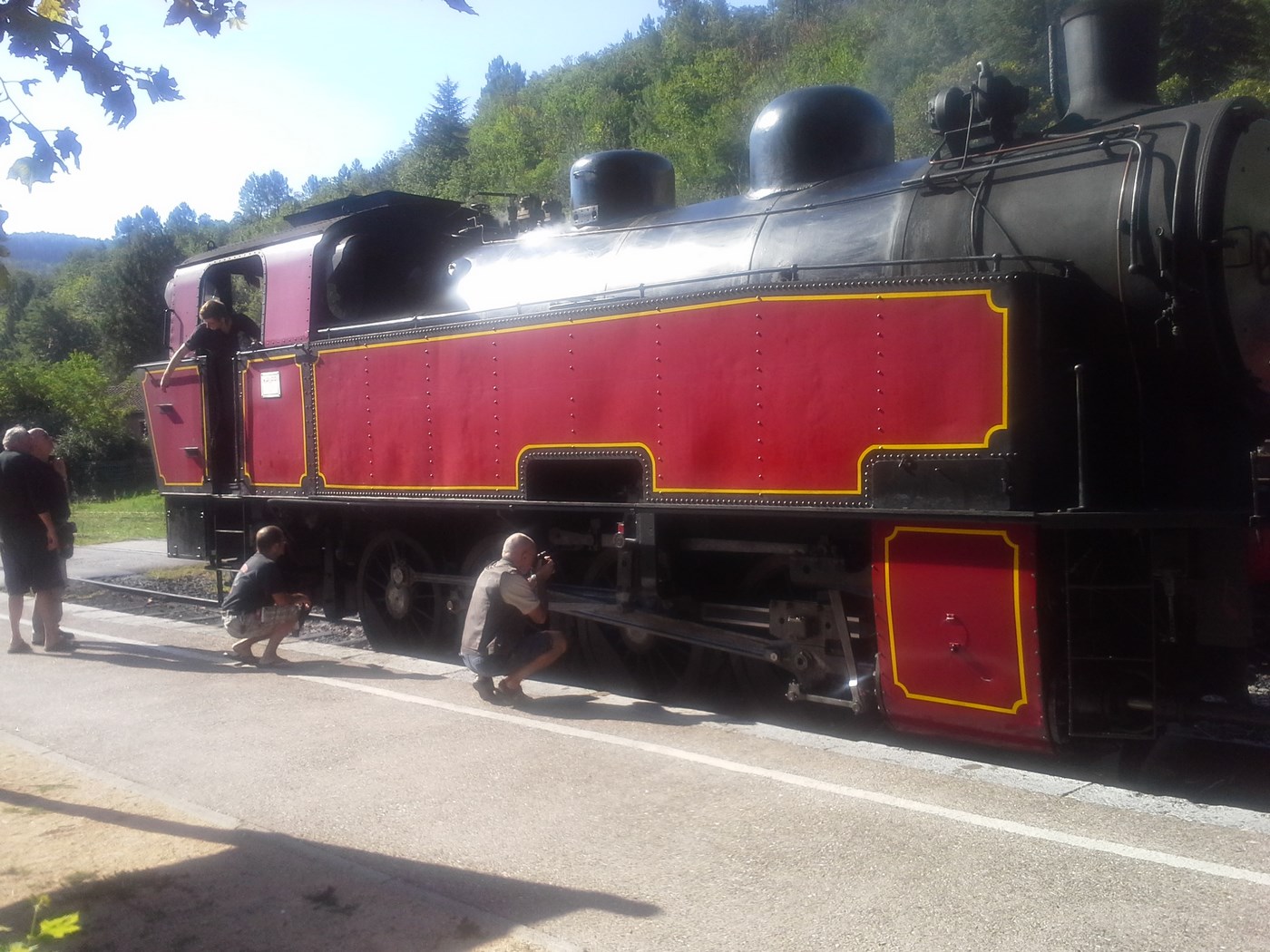 La balade du samedi matin a commencé par un voyage en train (Alain était aux anges et pour une fois le train était à l'heure). Nous sommes partis de SAINT JEAN DU GARD pour rejoindre ANDUZE avec un petit train à vapeur moins rapide qu'un vélo, avec plein de fumée et d'escarbilles. Bret on se serait cru dans un roman de Zola, la "Bête Humaine". Manquait plus que Gabin montant dans la cabine.